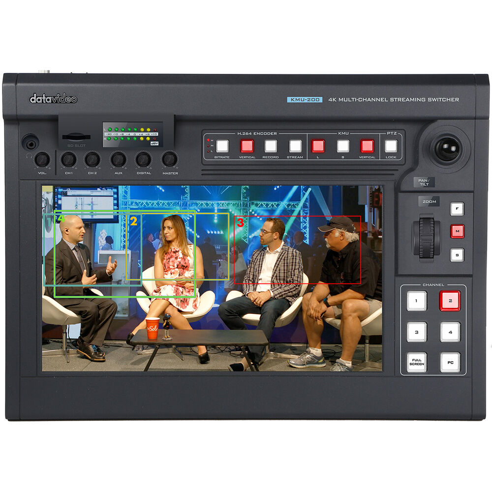 The Datavideo 4K Multicamera Touchscreen Switcher with Streaming and Recording is a touchscreen streaming switcher that can simultaneously record to an SD card. It supports programming in 16:9 or 9:16, so you can stream for traditional viewing, or for portrait mode viewing. It features one each UHD 4K and HD HDMI input. The switcher allows you to select regions of interest from the 4K video, essentially cutting four shots out of the UHD video, to use as your four inputs to switch between.