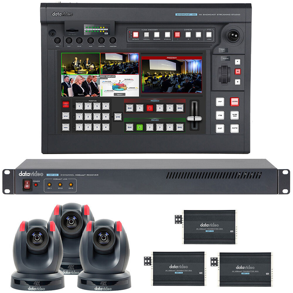 A complete setup for house of worship, event coverage, and multi-camera productions, the SHOWCAST 100-20X All-in-One Single-Operator 4K Production Bundle from Datvideo supports 4K input signals, allowing you to output HD over HDMI or stream over USB. This bundle includes the SHOWCAST 100 streaming switcher/mixer, three 4K PTZ cameras, three HDBaseT transmitters, and one 3-channel HDBaseT receiver.