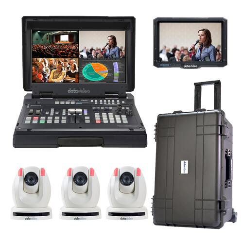 Produce, mix, and broadcast on location with this Streaming Studio Kit with Mobile Switcher, 7" Monitor & 3 x PTZ Cameras from Datavideo. The kit features everything you need to get started with a multicamera broadcast, including the HS-1600T Mark II 4-Channel HD/SD/HDBaseT Portable Video Streaming Studio for switching HDMI sources and streaming output, three white 1080p HDBaseT PTZ cameras, a 7" on-camera LCD monitor, and a wheeled trolley case to store and transport the entire kit.
