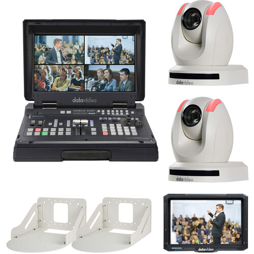 Add a compact PTZ camera streaming solution to your classroom, house of worship, or corporate conference room with this white Streaming Studio Kit with Switcher, 2 x PTZ Cameras, Wall Mounts & Monitor from Datavideo. The HS-1600T Mark II mobile switcher supports a single HDMI and three HDBaseT inputs, a single HDBaseT and three HDMI outputs, and a two-channel XLR audio input. Two PTZ cameras, a 7" monitor, and two WM-1 professional wall mounts are also included with the kit.