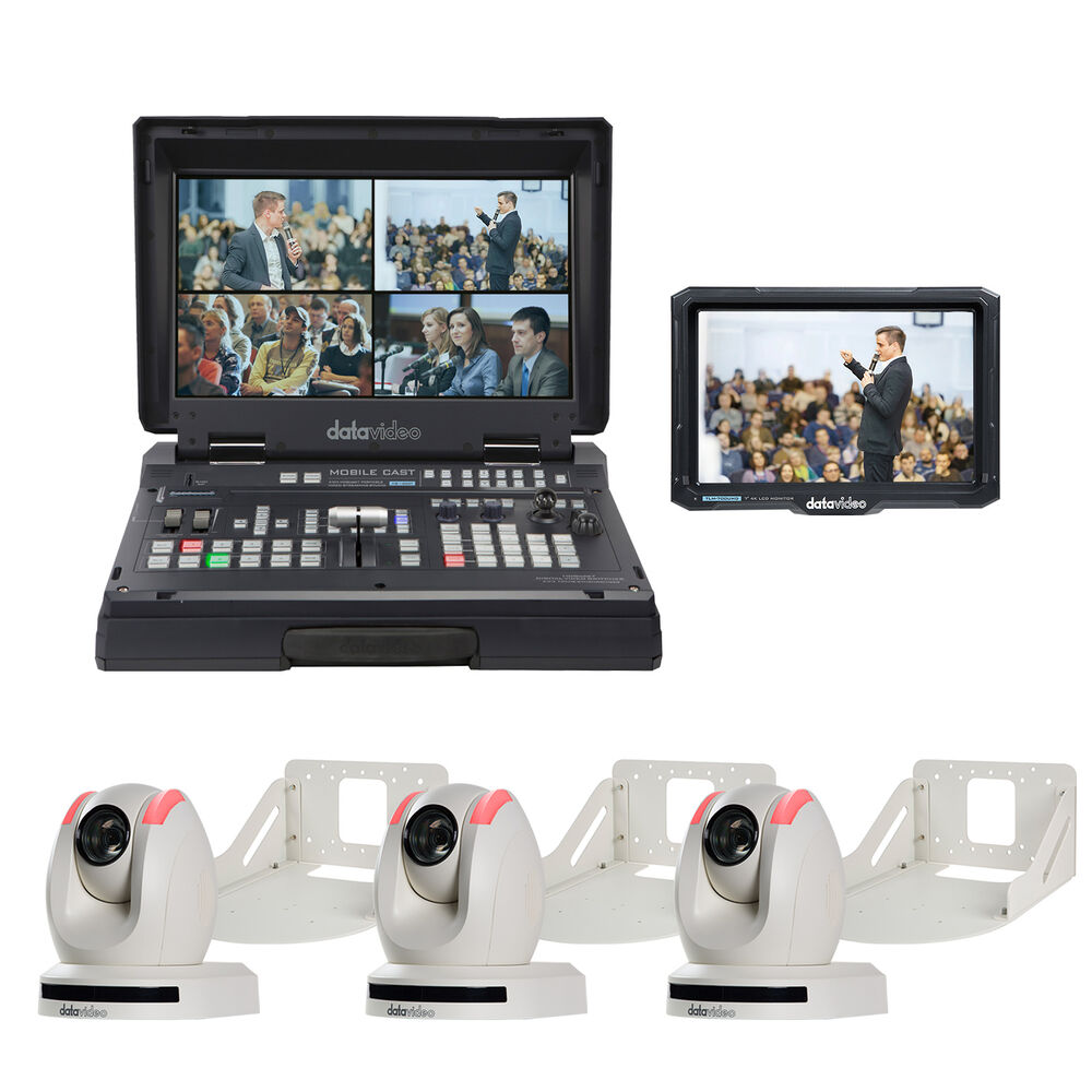 Add a compact PTZ camera streaming solution to your classroom, house of worship, or corporate conference room with this white Streaming Studio Kit with Switcher, 3 x PTZ Cameras, Wall Mounts & Monitor from Datavideo. The HS-1600T Mark II mobile switcher supports three HDBaseT inputs and a single HDMI input, three HDMI outputs and a single HDBaseT output, and a two-channel XLR audio input. Three PTZ cameras, a 7" monitor, and three WM-1 professional wall mounts are also included with the kit.