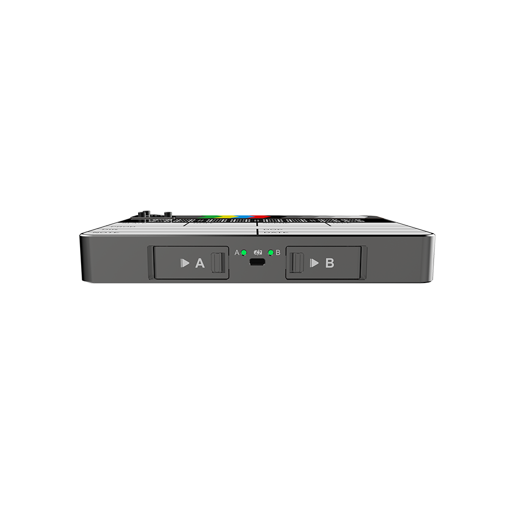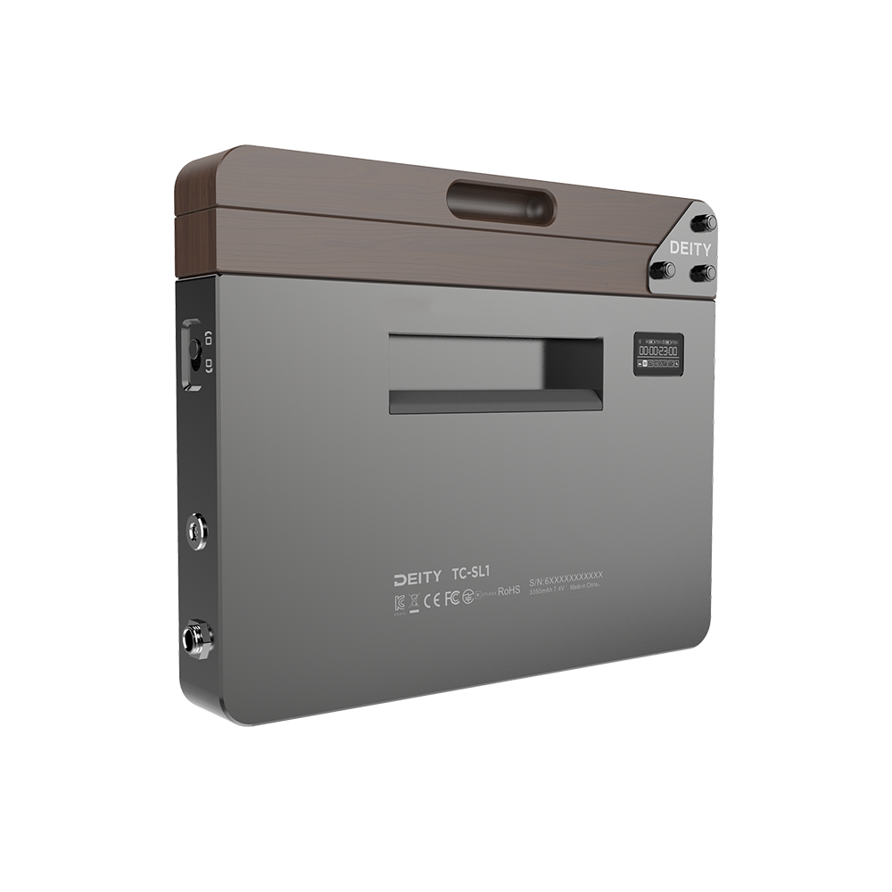 The Deity TC-SL1 is the world's first Bluetooth® enabled smart slate. Wirelessly sync the TC-SL1 from up to 250 feet away using its free phone app, Sidus Audio. You can also sync the TC-SL1 using your TC-1 timecode boxes. Featuring both 5-Pin and 1/4” TRS, the TC-SL1 will work with your existing timecode cables. And with the flick of a switch, the TC-SL1 can accommodate tail slating. The two NP-F550s can be hot-swapped between each other, and the USB-C port can support up to 30W charging. The wooden clapper is made from sustainably farmed Walnut lumber from the state of Tennessee.
