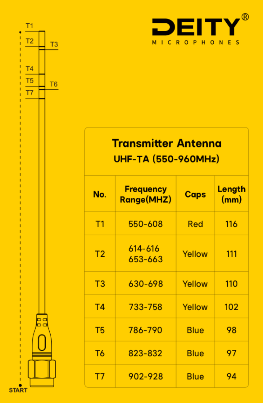 he Deity Microphones UHF-TA Theos is a replacement antenna for the Theos bodypack transmitter. It can be cut to length to accommodate different frequency needs. A chart is included, so you know how long to cut the antenna to the corresponding frequency band (550 to 960 MHz). Different color-coded caps are also included to help identify corresponding frequency bands