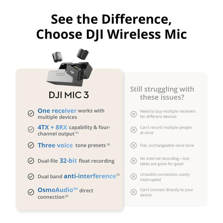 Content creators of all experience levels can raise the production values of their videos, interviews, and streaming with the DJI Mic 3, an easy-to-use, truly wireless digital microphone/recorder system that offers vivid audio quality while supplying all the elements needed to capture audio from your subject to a DSLR/mirrorless camera or iOS/Android smartphone. The system records clear and reliable audio at up to 1312' via a miniature clip-on omnidirectional mic/transmitters, which double as backup recorder for worry-free wireless. The tiny receiver can either be mounted on a DSLR camera or plugged directly into the USB-C port of a smartphone or laptop. Simply complete the initial setup and you can be ready to record quality audio in seconds.