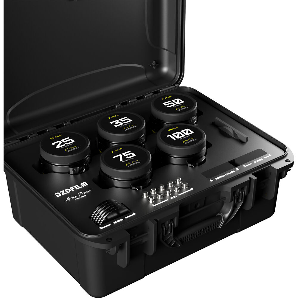 This DZOFilm Arles FF/VV Prime Cine 5-Lens Set includes five commonly used focal lengths for most cases. Included in this ARRI PL full-frame compatible set are 25, 35, 50, 75, and 100mm lenses. All the lenses share similar gearing, iris blades, front diameters, and aperture ranges for easy switching. See below for more information on the individual lenses included in this kit.