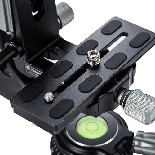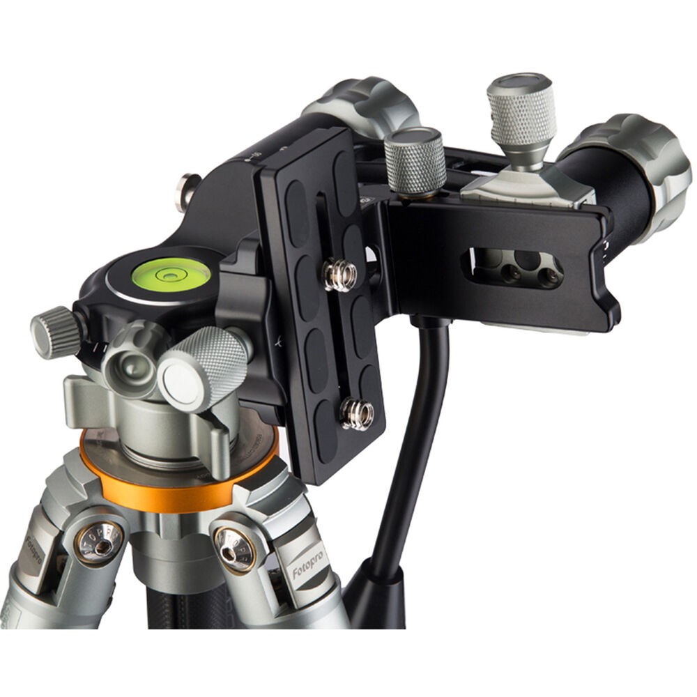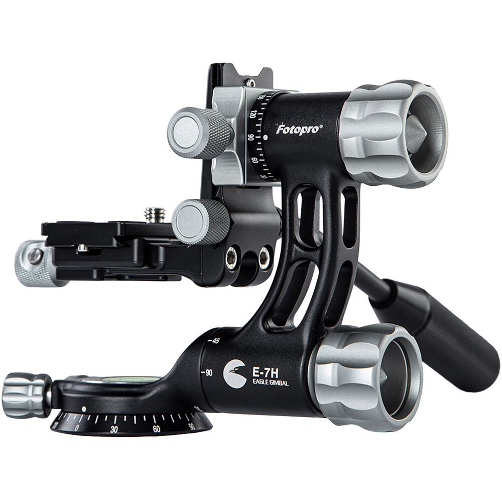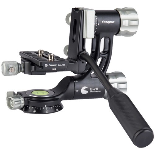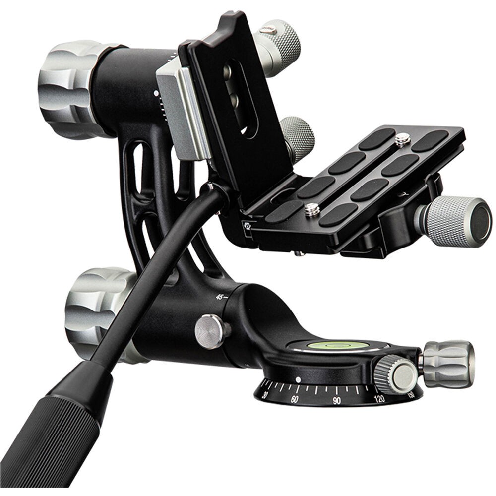 Support setups weighing up to 22 lb with the 11" tall, Arca-type compatible E-7H Gimbal Head from Fotopro. Both the vertical and horizontal planes are independently adjustable to perfectly balance your lens, so it can rotate and swing smoothly on each axis. A removable panning bar is included for easy adjustment and control for video applications, with the rotation of the head secured by an independent pan lock with tension adjustment. Additional features like engraved degree marks and a bubble level assist with precise adjustment.