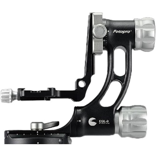 The 8.1" tall, arca-type compatible E-9H Gimbal Head from Fotopro allows you to maneuver large camera equipment weighing up to 66.1 lb with ease. Both the vertical and horizontal planes are adjustable to perfectly balance your lens, so it can rotate and swing smoothly on each axis. A removable panning bar is included to help follow a fast-moving subject; the rotation of the head is secured with its independent pan lock.