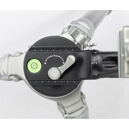 The 10.5 lb support includes the gimbal head with independent screw knobs to control the 360° rotation of the head and the swing of the camera platform. The camera platform can be balanced vertically and horizontally to accommodate the size and weight of the camera. Therefore, it gives you the freedom of moving large telephoto lenses without effort. The swinging camera platform is Arca-type compatible, and the head has a built-in leveler, which eliminates the need for raising or lowering the legs to level the tripod.
