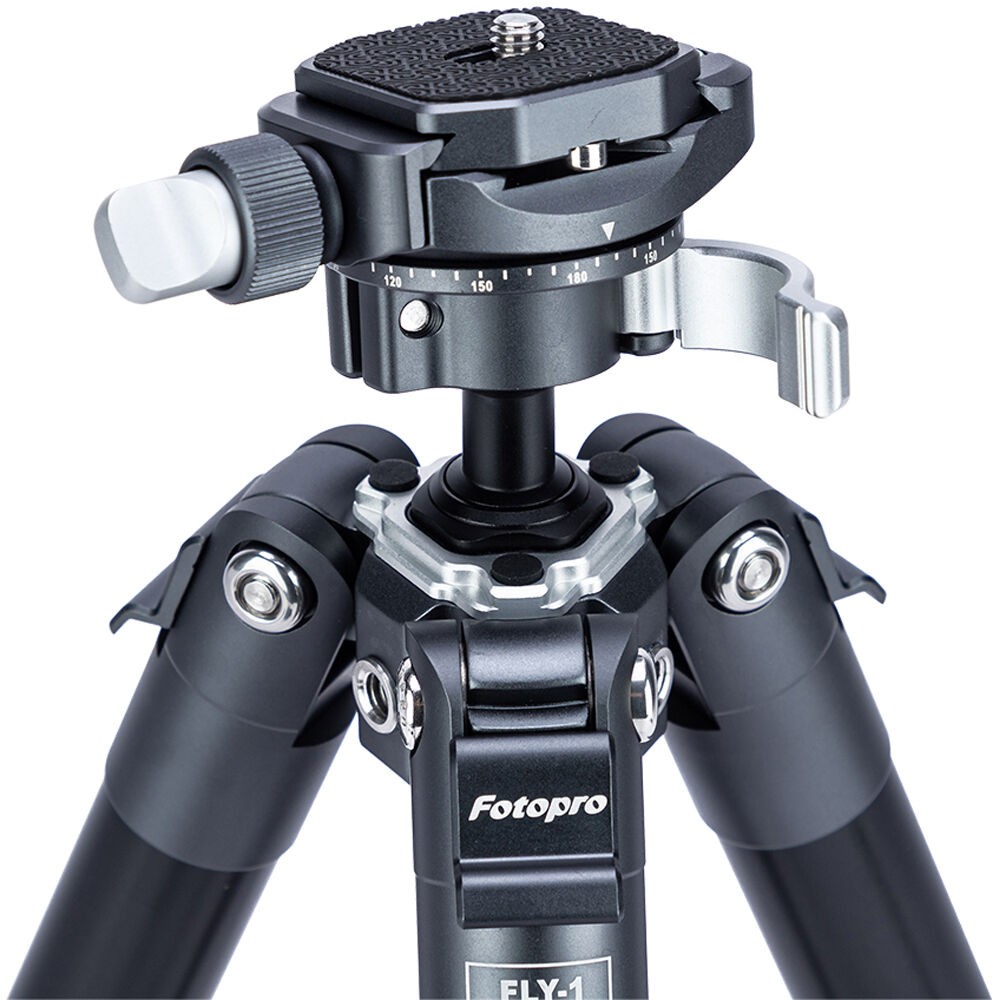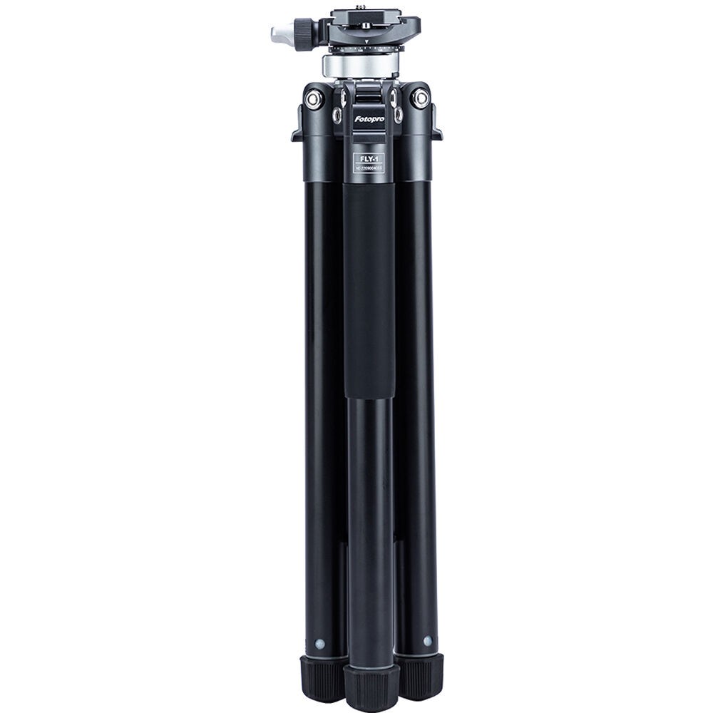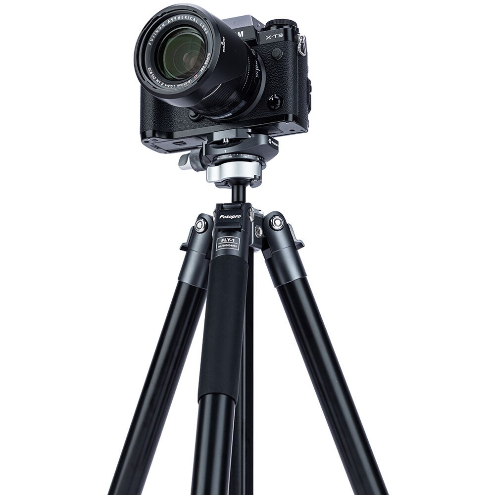The FLY-1 Aluminum Travel Tripod with Arca-Type Ball Head from Fotopro is a compact and lightweight aluminum travel tripod designed for travel and location photography. It has a maximum height of 59.3" and can support cameras weighing up to 11 pounds, but weighs only 2.2 pounds. It folds down to a compact 14.8", easy to tuck into a backpack or carry-on luggage. The legs quickly extend and collapse with a simple twist. Each leg can be positioned independently, making it possible to level the tripod on uneven surfaces.