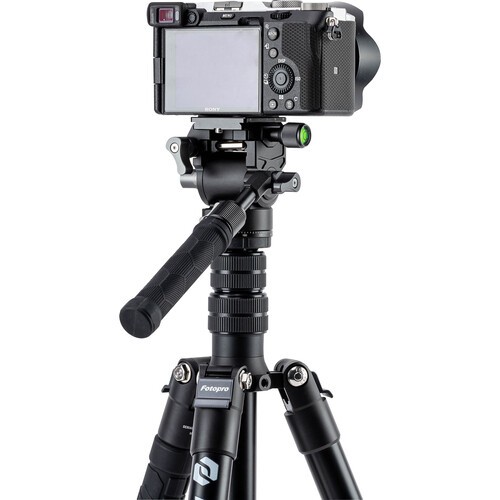 The compact head features a quick release plate with a 1/4"-20 camera mounting screw for quick changing of your camera rig. It has a tilt range of -90 to 55°, it can pan a full 360°, and it features independent pan and tilt locks. It can also tilt up to 90° laterally, allowing for horizontal or vertical shooting. The included pan handle can be installed on either the right or left side of the head, and it is length-adjustable. It also features a bubble level for balancing. An Allen wrench is included to help tighten the plate onto your rig, and it stores within the head.