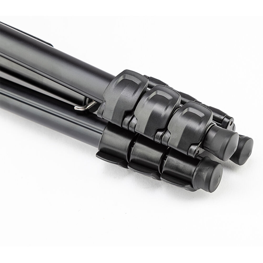 The center column allows you to open the tripod legs so your tripod head can become lower to the ground. The removable head also features a bubble level, half-ball leveling adjustment, a 3/8"-16 mounting screw for different heads, a dovetail-style plate, and a pan bar with a padded grip.