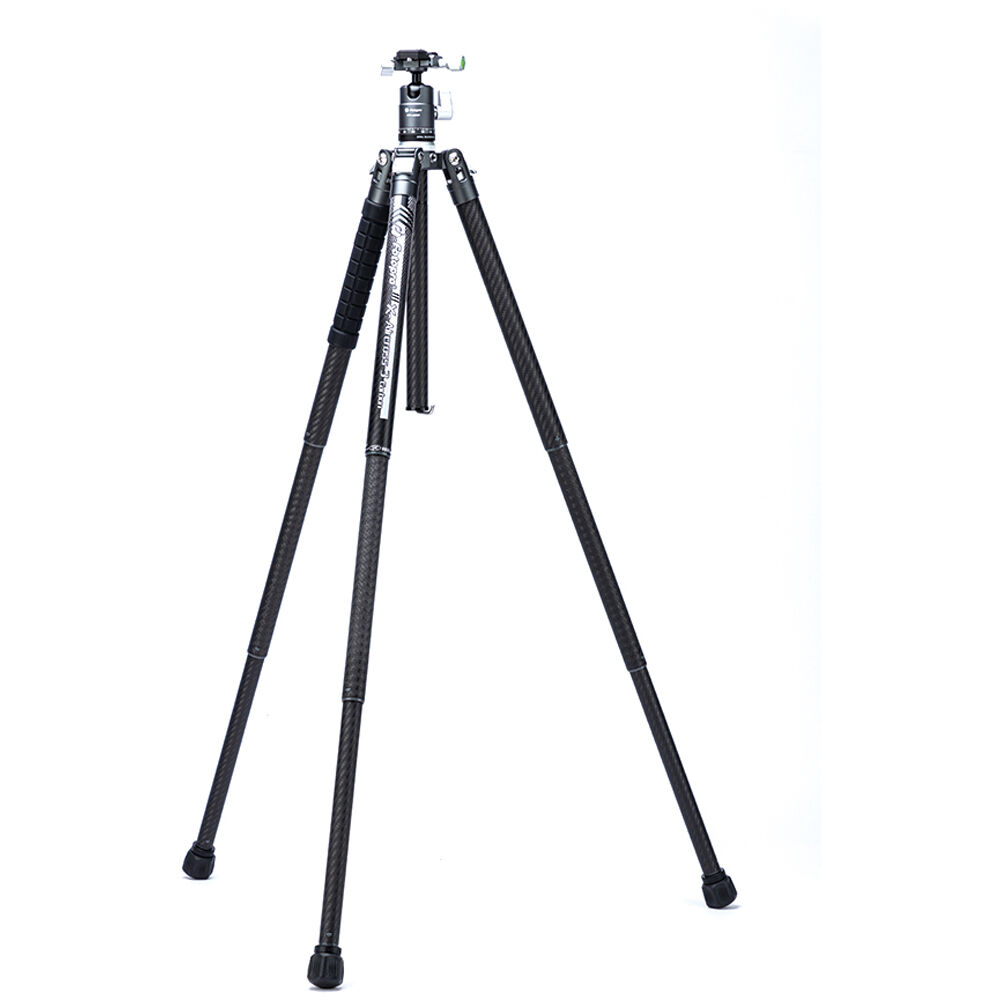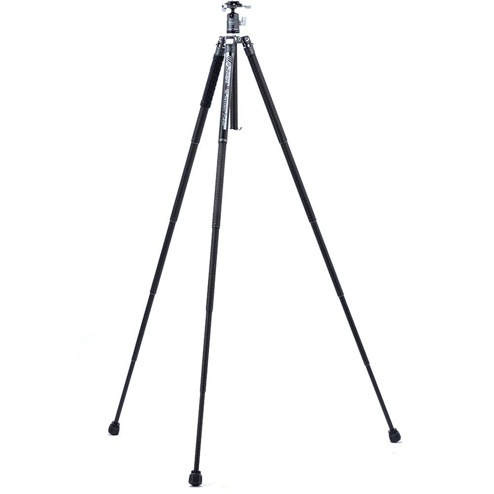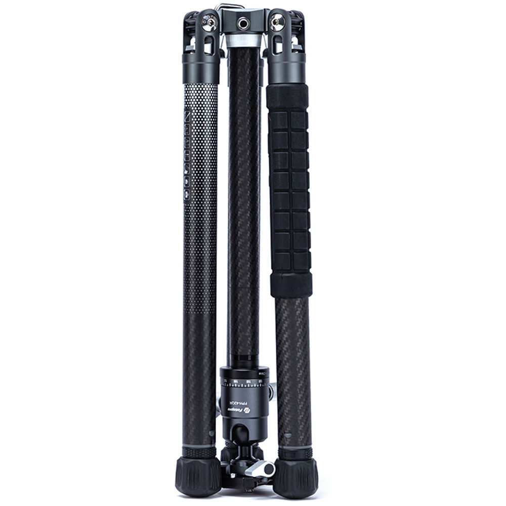The X-Aircross 3 Carbon Fiber Travel Tripod with FPH-42QR Ball Head from Fotopro is a compact and lightweight carbon fiber travel tripod designed for travel and location photography. It has a maximum height of 59.4" and can support cameras weighing up to 22 pounds, but weighs only 2.07 pounds. It folds down to a compact 14.4", easy to tuck into a backpack or carry-on luggage. The legs quickly extend and collapse with a simple twist. Each leg can be positioned independently and has three available locking positions, making it possible to level the tripod on uneven surfaces.