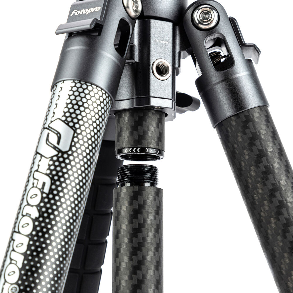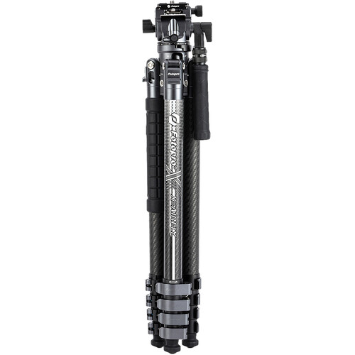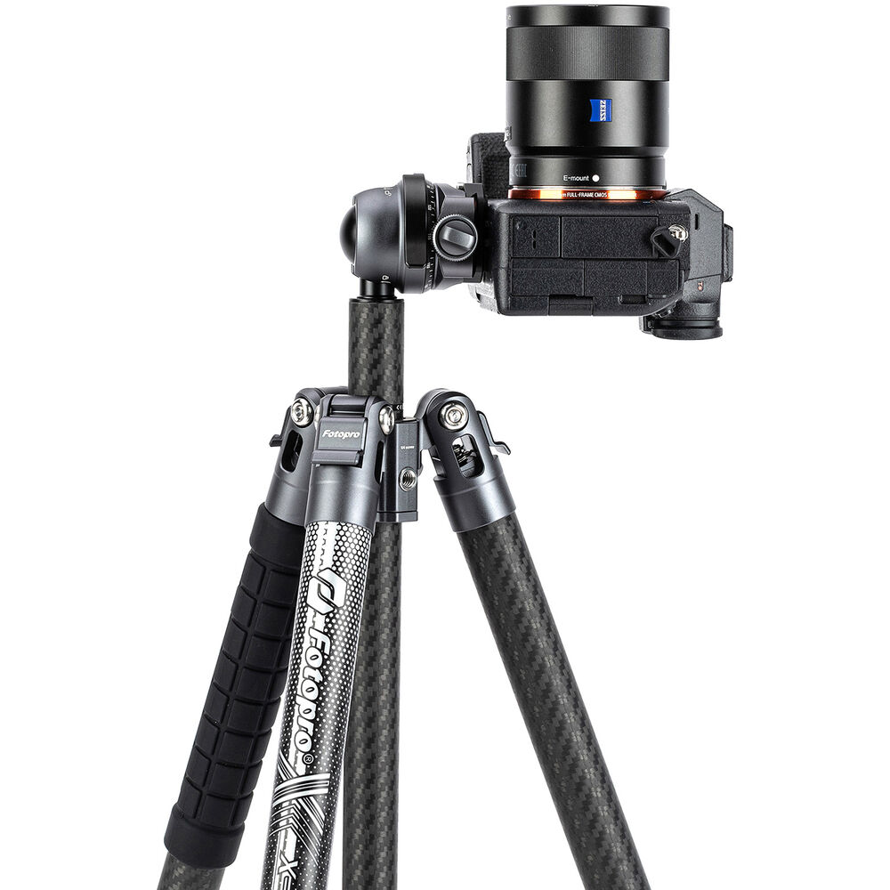 The gray X-AIRFLY Video Tripod from Fotopro is a compact and lightweight carbon fiber travel tripod designed for travel and location photography and videography. It has a maximum height of 64.5", supports cameras weighing up to 9.9 lb, and weighs only 3 lb. It folds down to a compact 21.5" and is easy to tuck into a backpack or carry-on luggage. The fluid head can be used with heavier video rigs and converts to a locking ball head for more stability and fine adjustments for photography.