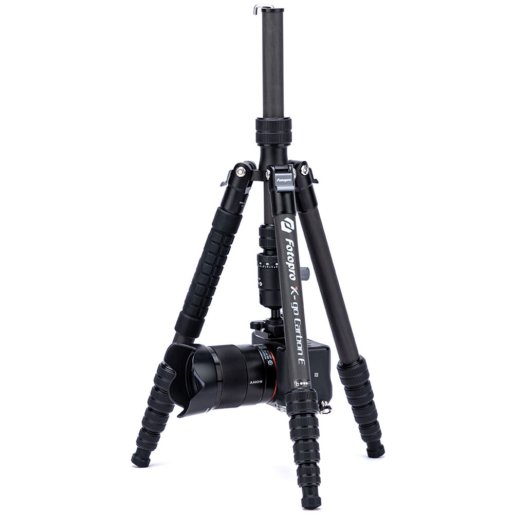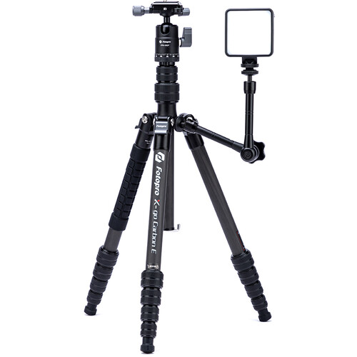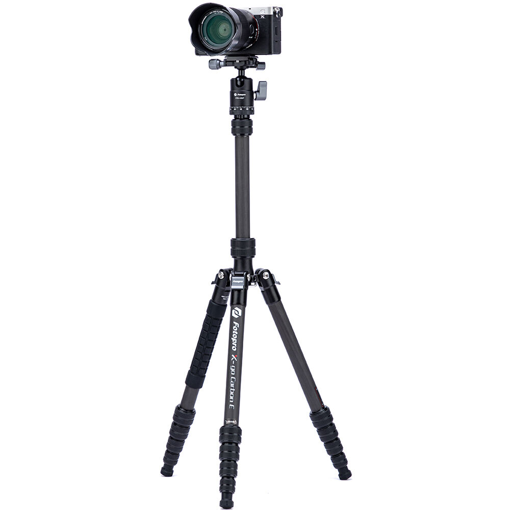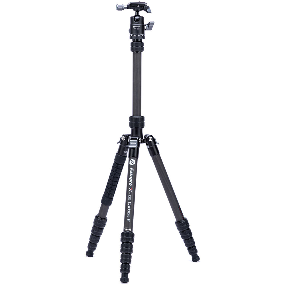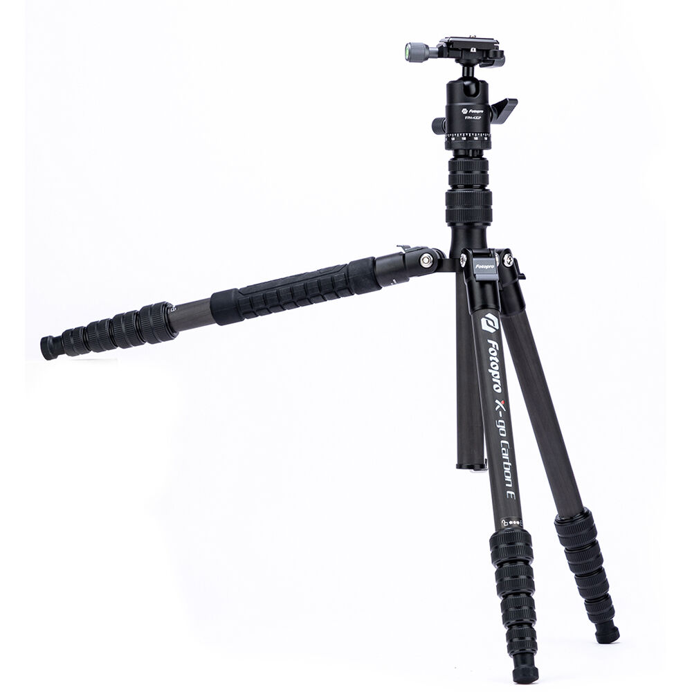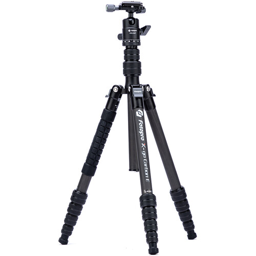 The X-Go Carbon Fiber E Tripod with FPH-42QP Ball Head from Fotopro is a lightweight and portable travel tripod paired with an Arca-type ball head, which also converts into a 61.9" monopod when needed. It has a load capacity of 17.6 lb and maximum height of 59.9", but weighs only 2.16 lb and folds down to a compact 14.2", making it easy to carry along whenever a tripod is needed. It easily fits in most backpacks and carry-on luggage. The lightweight, 5-section carbon fiber legs feature twist-lock joints for fast setup. Each leg has a steel spiked tip with a rubber foot covering for traction on virtually any surface. The 2-section center column extends rapidly, and features a ballast hook for added stability.