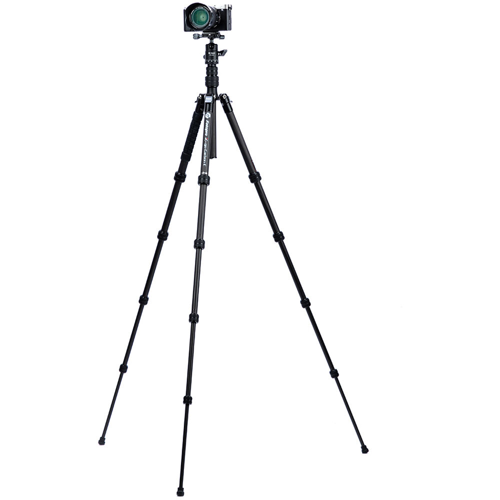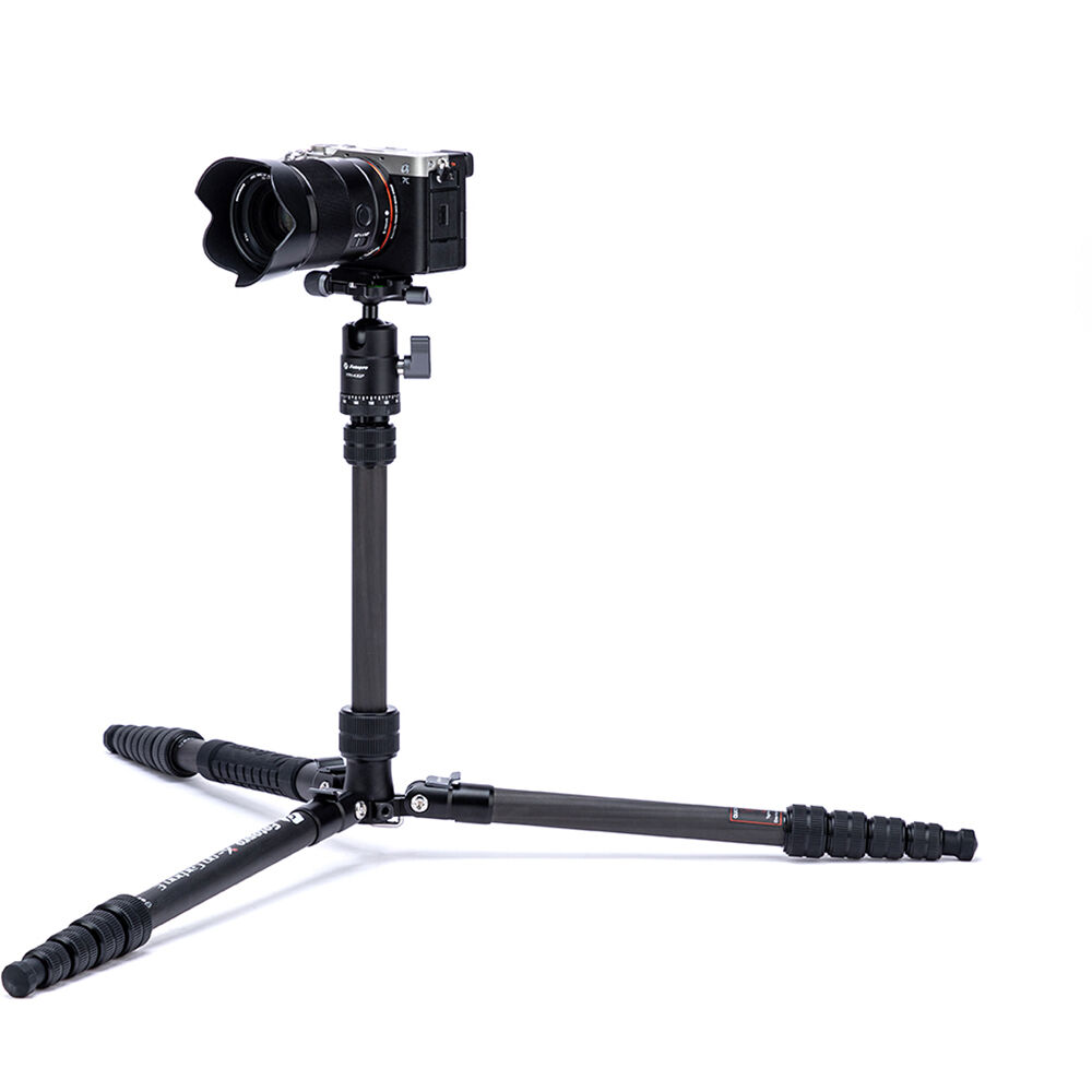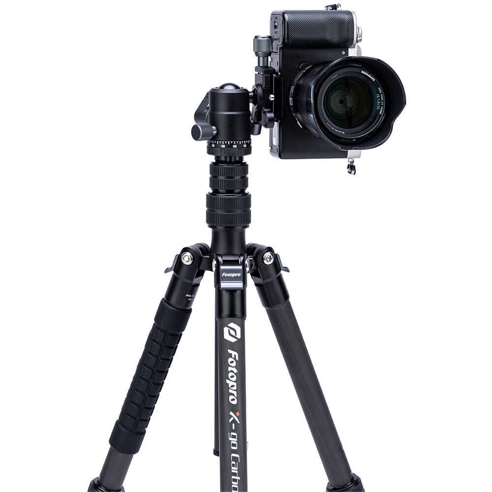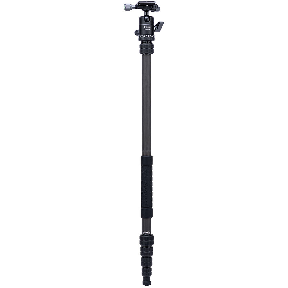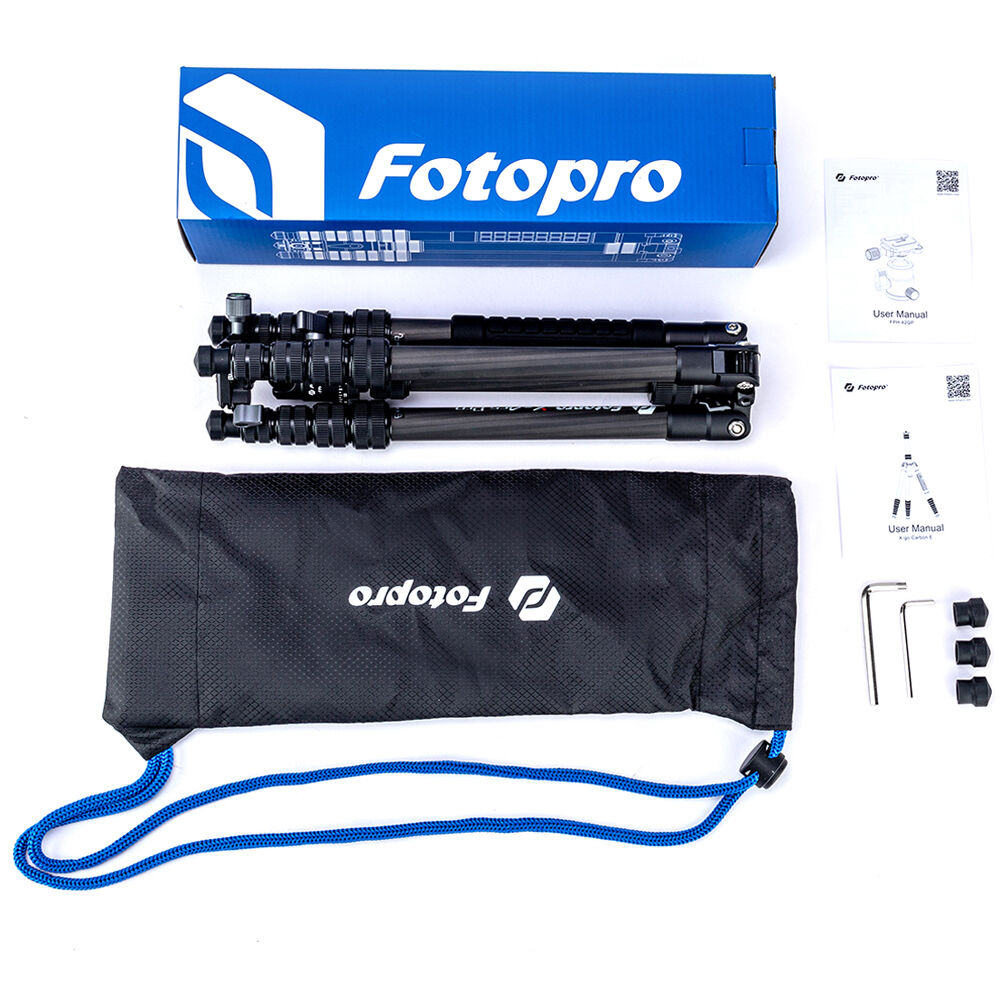 The X-Go Carbon Fiber E Tripod with FPH-42QP Ball Head from Fotopro is a lightweight and portable travel tripod paired with an Arca-type ball head, which also converts into a 61.9" monopod when needed. It has a load capacity of 17.6 lb and maximum height of 59.9", but weighs only 2.16 lb and folds down to a compact 14.2", making it easy to carry along whenever a tripod is needed. It easily fits in most backpacks and carry-on luggage. The lightweight, 5-section carbon fiber legs feature twist-lock joints for fast setup. Each leg has a steel spiked tip with a rubber foot covering for traction on virtually any surface. The 2-section center column extends rapidly, and features a ballast hook for added stability.