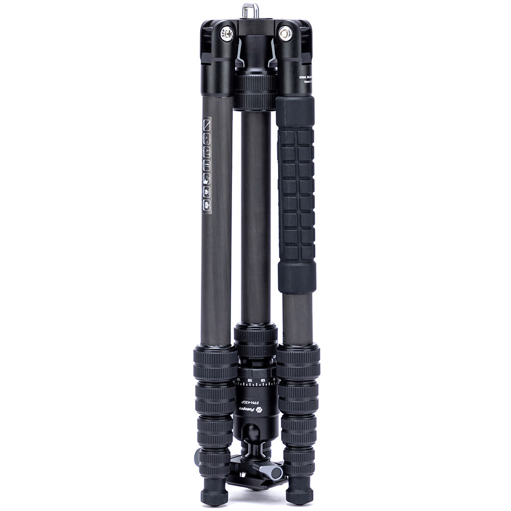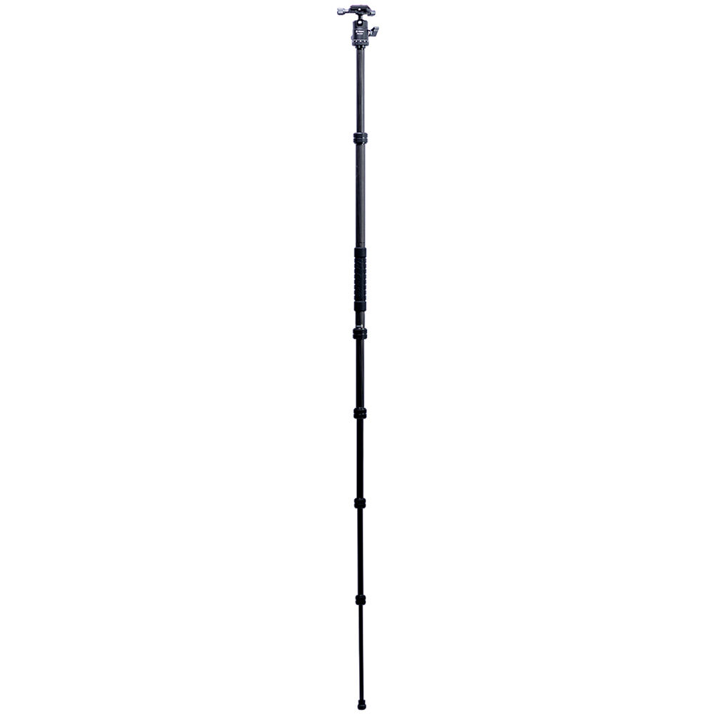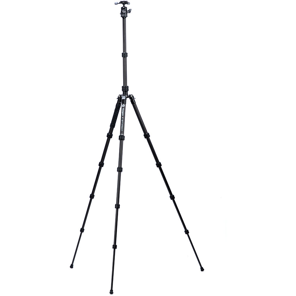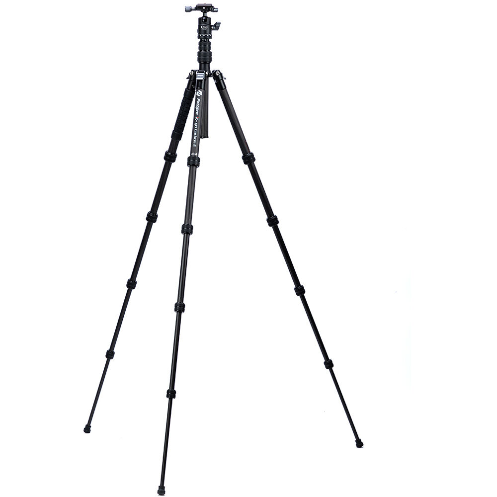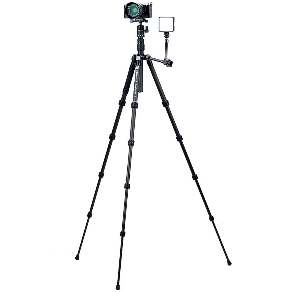 The X-Go Carbon Fiber E Tripod with FPH-42QP Ball Head from Fotopro is a lightweight and portable travel tripod paired with an Arca-type ball head, which also converts into a 61.9" monopod when needed. It has a load capacity of 17.6 lb and maximum height of 59.9", but weighs only 2.16 lb and folds down to a compact 14.2", making it easy to carry along whenever a tripod is needed. It easily fits in most backpacks and carry-on luggage. The lightweight, 5-section carbon fiber legs feature twist-lock joints for fast setup. Each leg has a steel spiked tip with a rubber foot covering for traction on virtually any surface. The 2-section center column extends rapidly, and features a ballast hook for added stability.
