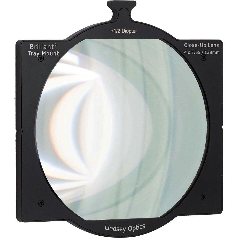The 4 x 5.65" +1/2 Diopter Brilliant Tray Mount Close-Up Lens from Lindsey Optics fits directly into 4 x 5.65" matte boxes, occupying one slot in the matte box. A close-up lens with a strength of +1/2 is used to get very close-up images of small objects when the cine lens being used won't focus that closely. To create the Brilliant Tray Mount Close-Up Lens series, Lindsey Optics mounted the 138mm Close-Up Lenses in a 4 x 5.65" matte box tray. These large 138mm round lenses provide a 5.1" diameter clear aperture in the tray, allowing use with large lenses and wide angle lenses. The lens have a broadband multi-layer anti-reflection coating. The unique tray mount design allows quick and easy changes of close-up lenses in both clip-on and rod mount matte boxes.