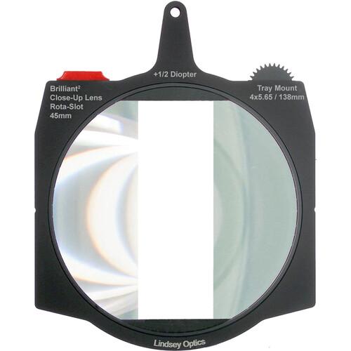 The Brilliant 4 x 5.65" Air Gap Diopter Rota-Split Close-Up Lens from Lindsey Optics is a unique close-up lens designed for use with 4 x 5.65" matte boxes. The 138mm +1/2 diopter has been cut in half and mounted in a geared rotating tray for quick and easy alignment of the split line, with a 45mm air gap in the middle. Split field diopters like this can be used for creative near/far focusing effects in your frame; the cut edge of the lens is usually aligned with an edge in the scene, such as a door frame. This hides the transition line and creates a seamless near/far effect. The rotating design allows you to control the alignment of the lens split and lines of your scene with precision and ease.