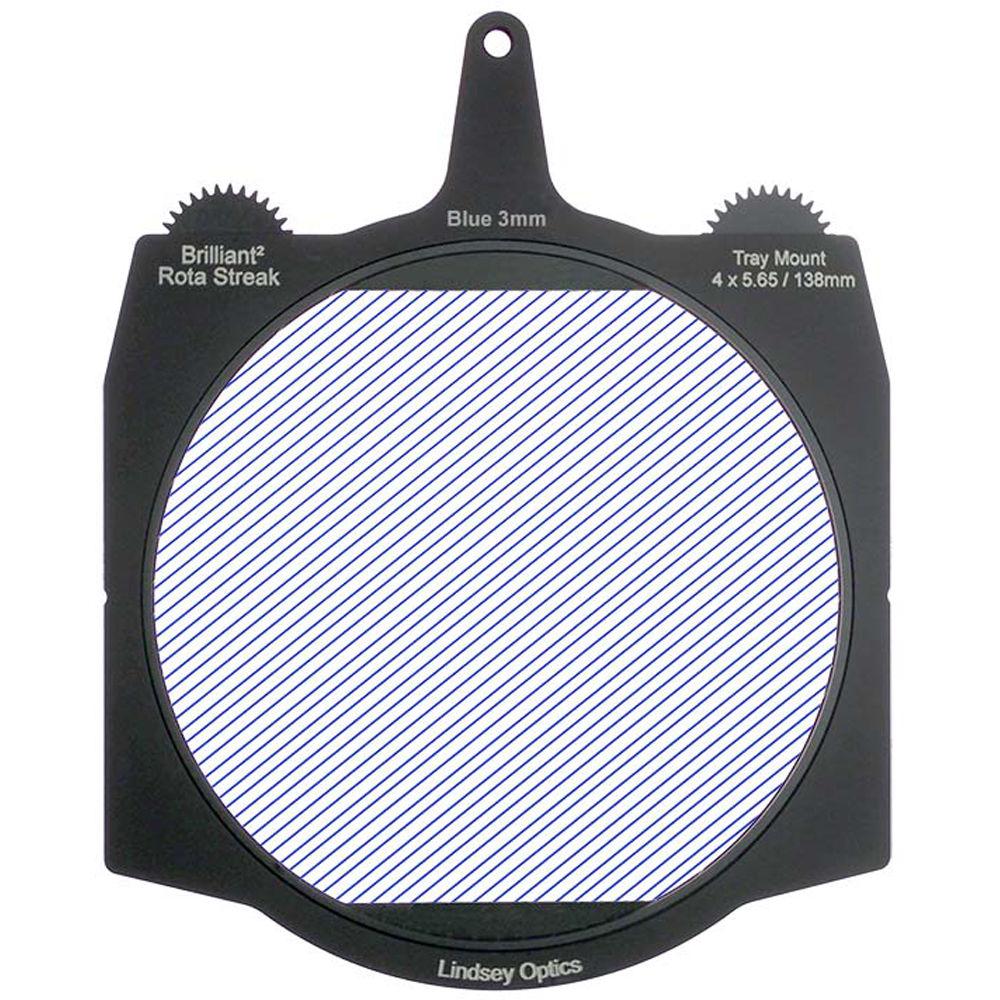 This blue 3mm 2-point streak Brilliant² 4 x 5.65" Rota-Streak Filter from Lindsey Optics is a 138mm glass filter in a frame made to fit 4 x 5.65" matte boxes. The filter can be rotated manually or by using a motor to position the filter effect in any desired position. It adds an in-camera streak effect on bright lights and highlights in a scene.