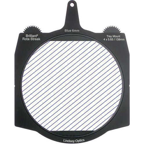 This blue 2mm 2-point streak Brilliant² 4 x 5.65" Rota-Streak Filter from Lindsey Optics is a 138mm glass filter in a frame made to fit 4 x 5.65" matte boxes. The filter can be rotated manually or by using a motor to position the filter effect in any desired position. It adds an in-camera streak effect on bright lights and highlights in a scene.