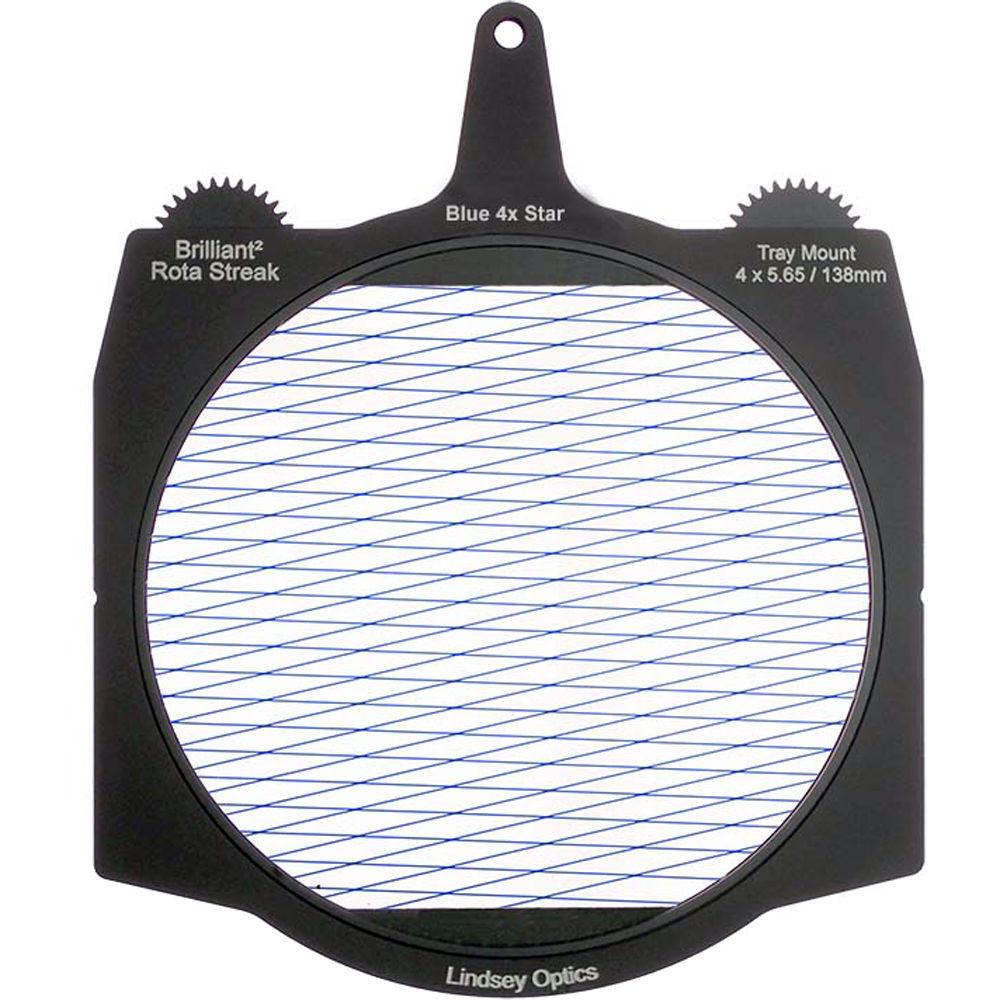 This blue 4-point star Brilliant² 4 x 5.65" Rota-Streak Filter from Lindsey Optics is a 138mm glass filter in a frame made to fit 4 x 5.65" matte boxes. The filter can be rotated manually or by using a motor to position the filter effect in any desired position. It adds an in-camera star effect on bright lights and highlights in a scene.