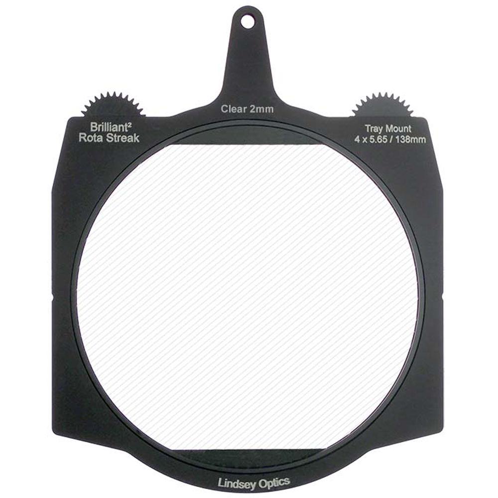 This clear 2mm 2-point streak Brilliant² 4 x 5.65" Rota-Streak Filter from Lindsey Optics is a 138mm glass filter in a frame made to fit 4 x 5.65" matte boxes. The filter can be rotated manually or by using a motor to position the filter effect in any desired position. It adds an in-camera streak effect on bright lights and highlights in a scene.