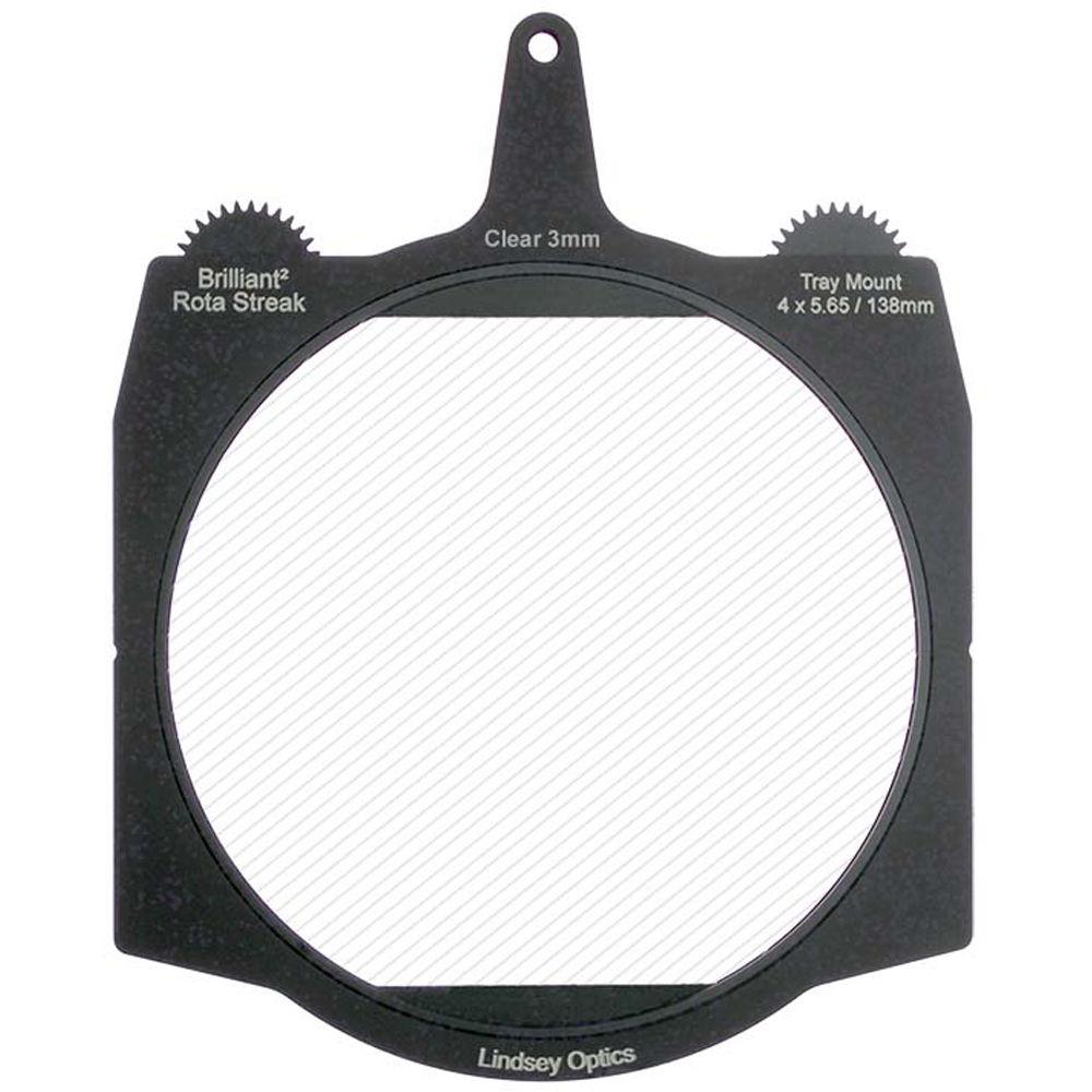 This clear 3mm 2-point streak Brilliant² 4 x 5.65" Rota-Streak Filter from Lindsey Optics is a 138mm glass filter in a frame made to fit 4 x 5.65" matte boxes. The filter can be rotated manually or by using a motor to position the filter effect in any desired position. It adds an in-camera streak effect on bright lights and highlights in a scene.