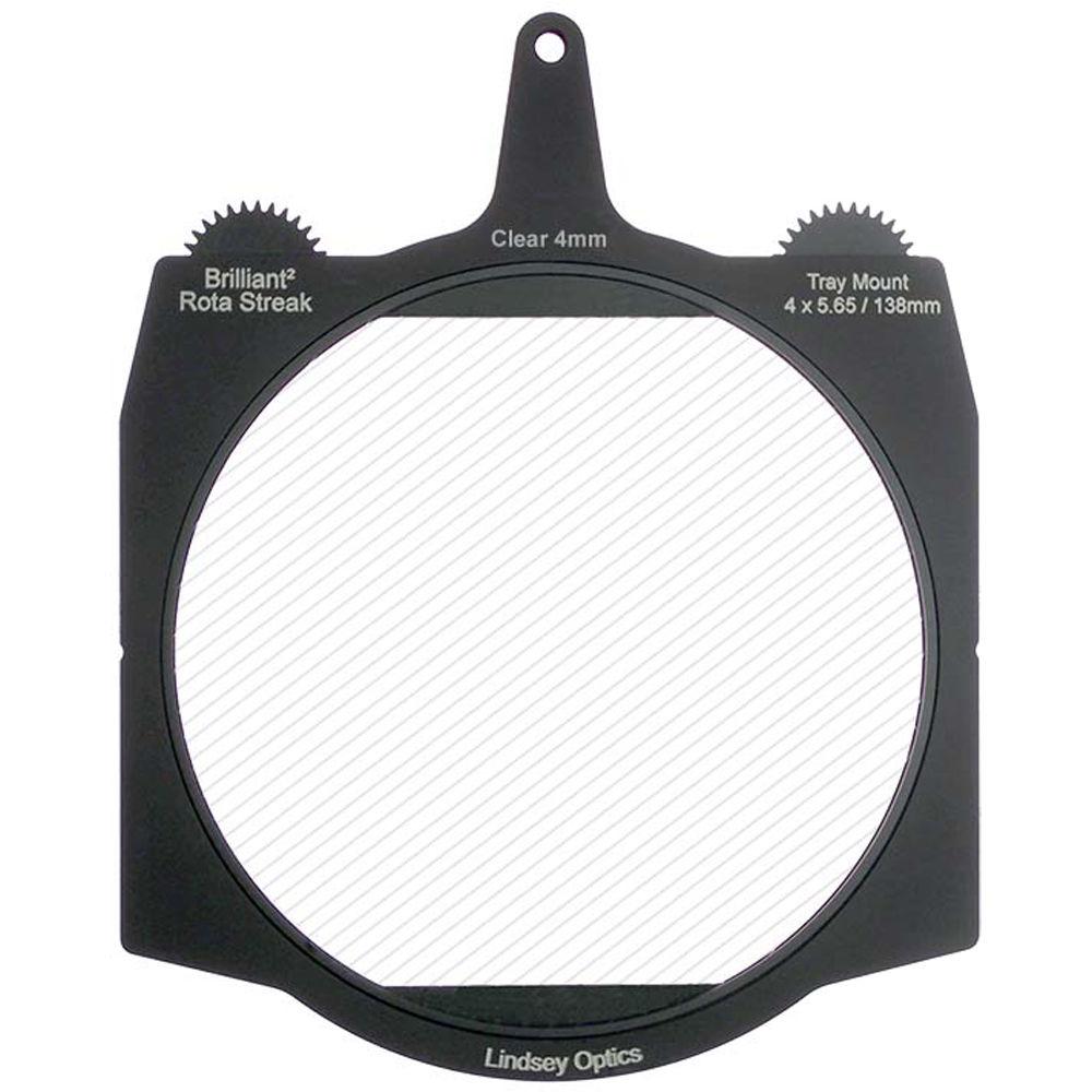 This clear 4mm 2-point streak Brilliant² 4 x 5.65" Rota-Streak Filter from Lindsey Optics is a 138mm glass filter in a frame made to fit 4 x 5.65" matte boxes. The filter can be rotated manually or by using a motor to position the filter effect in any desired position. It adds an in-camera streak effect on bright lights and highlights in a scene.