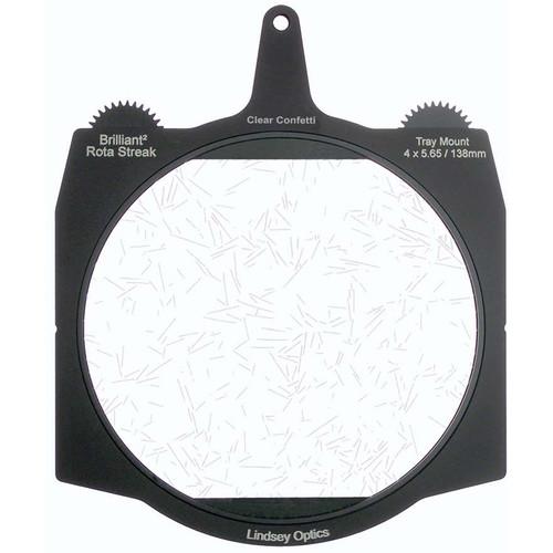 This clear confetti Brilliant² 4 x 5.65" Rota-Streak Filter from Lindsey Optics is a 138mm glass filter in a frame made to fit 4 x 5.65" matte boxes. The filter can be rotated manually or by using a motor to position the filter effect in any desired position. It adds an in-camera confetti effect on bright lights and highlights in a scene.