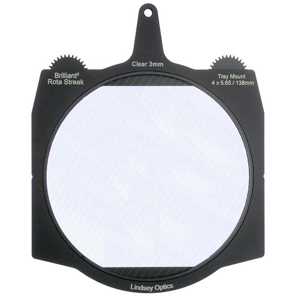 This green 3mm 2-point streak Brilliant² 4 x 5.65" Rota-Streak Filter from Lindsey Optics is a 138mm glass filter in a frame made to fit 4 x 5.65" matte boxes. The filter can be rotated manually or by using a motor to position the filter effect in any desired position. It adds an in-camera streak effect on bright lights and highlights in a scene.