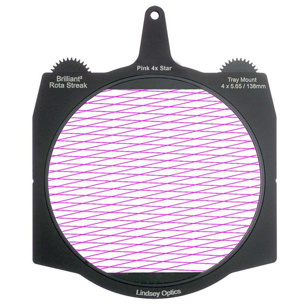 This pink 4-point star Brilliant² 4 x 5.65" Rota-Streak Filter from Lindsey Optics is a 138mm glass filter in a frame made to fit 4 x 5.65" matte boxes. The filter can be rotated manually or by using a motor to position the filter effect in any desired position. It adds an in-camera star effect on bright lights and highlights in a scene.