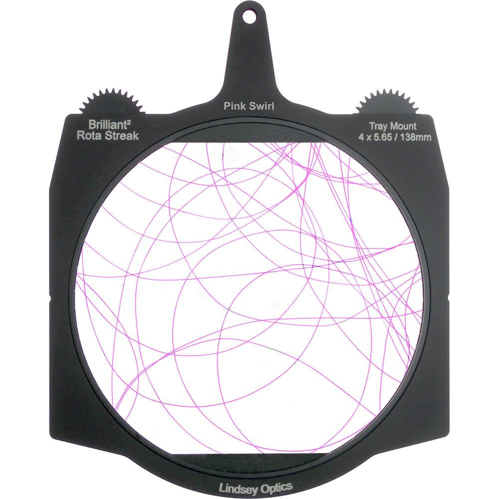 This pink swirl Brilliant² 4 x 5.65" Rota-Streak Filter from Lindsey Optics is a 138mm glass filter in a frame made to fit 4 x 5.65" matte boxes. The filter can be rotated manually or by using a motor to position the filter effect in any desired position. It adds an in-camera swirl effect on bright lights and highlights in a scene.