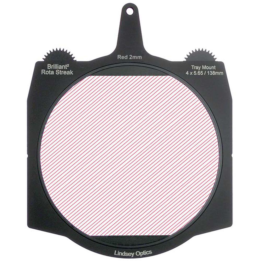 This red 2mm 2-point streak Brilliant² 4 x 5.65" Rota-Streak Filter from Lindsey Optics is a 138mm glass filter in a frame made to fit 4 x 5.65" matte boxes. The filter can be rotated manually or by using a motor to position the filter effect in any desired position. It adds an in-camera streak effect on bright lights and highlights in a scene.