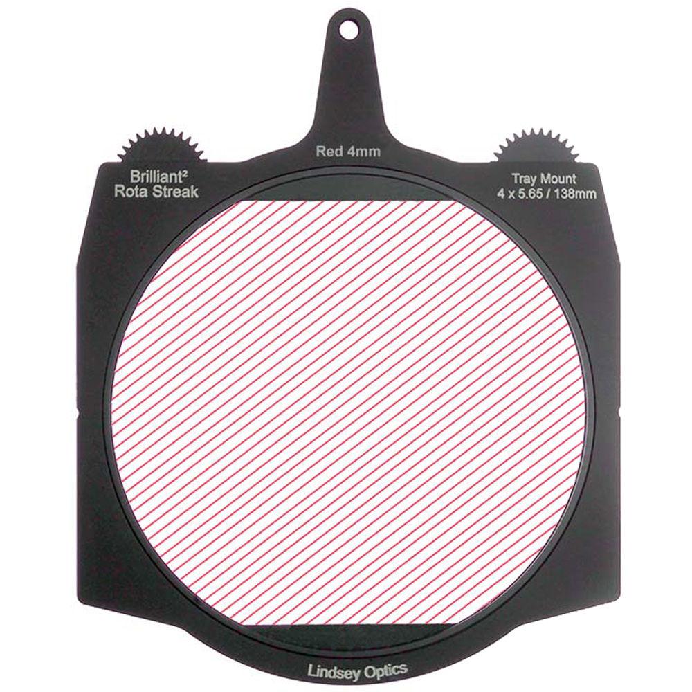 This red 4mm 2-point streak Brilliant² 4 x 5.65" Rota-Streak Filter from Lindsey Optics is a 138mm glass filter in a frame made to fit 4 x 5.65" matte boxes. The filter can be rotated manually or by using a motor to position the filter effect in any desired position. It adds an in-camera streak effect on bright lights and highlights in a scene.