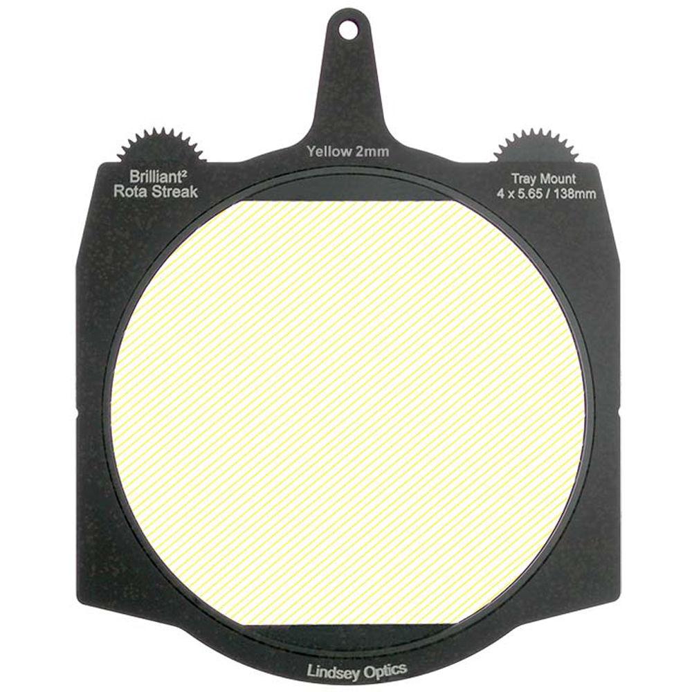 This yellow 2mm 2-point streak Brilliant² 4 x 5.65" Rota-Streak Filter from Lindsey Optics is a 138mm glass filter in a frame made to fit 4 x 5.65" matte boxes. The filter can be rotated manually or by using a motor to position the filter effect in any desired position. It adds an in-camera streak effect on bright lights and highlights in a scene.