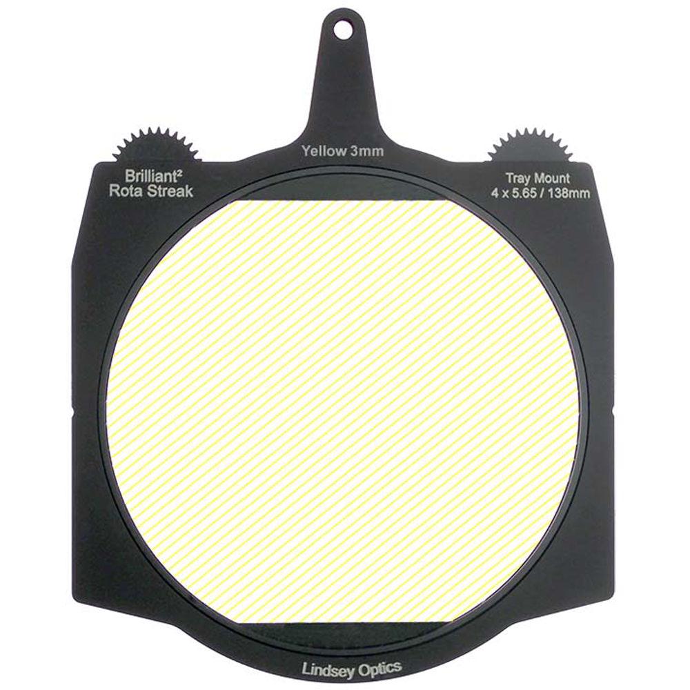 This yellow 3mm 2-point streak Brilliant² 4 x 5.65" Rota-Streak Filter from Lindsey Optics is a 138mm glass filter in a frame made to fit 4 x 5.65" matte boxes. The filter can be rotated manually or by using a motor to position the filter effect in any desired position. It adds an in-camera streak effect on bright lights and highlights in a scene.