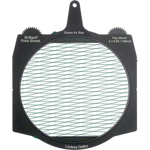 This Brilliant² Rota-Streak Filter from Lindsey Optics is a glass filter in a frame made to fit most standard 6.6 x 6.6" matte boxes. The filter has embedded green rods in a fixed pattern to create a star streak effect on bright lights and highlights in the shot. The filter frame features two gears, one on each side of the tray, for flexibility in rotating the filter from either side of the lens. Rotate the filter either manually or by using a motor to orient the filter's effect in any desired position.
