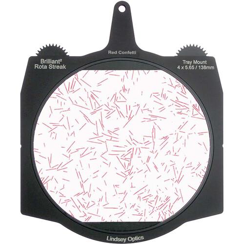 This Brilliant² Rota-Streak Filter from Lindsey Optics is a glass filter in a frame made to fit most standard 6.6 x 6.6" matte boxes. The filter has embedded red rods in a random pattern to create a confetti streak effect on bright lights and highlights in the shot. The filter frame features two gears, one on each side of the tray, for flexibility in rotating the filter from either side of the lens. Rotate the filter either manually or by using a motor to orient the filter's effect in any desired position.
