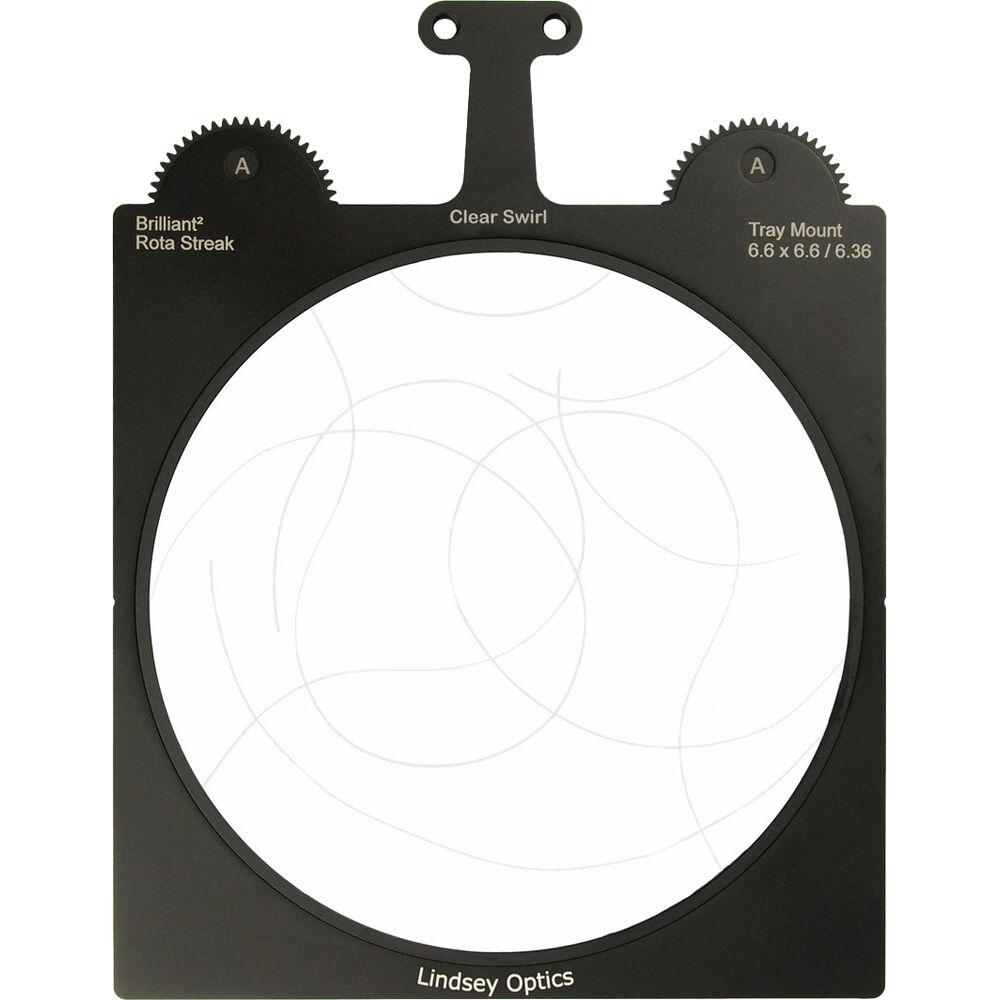 This Brilliant² Rota-Streak Filter from Lindsey Optics is a glass filter in a frame made to fit most standard 6.6 x 6.6" matte boxes. The filter has embedded clear curved rods in a random pattern to create a swirl streak effect on bright lights and highlights in the shot. The filter frame features two gears, one on each side of the tray, for flexibility in rotating the filter from either side of the lens. Rotate the filter either manually or by use a motor to orient the filter's effect in your desired position.