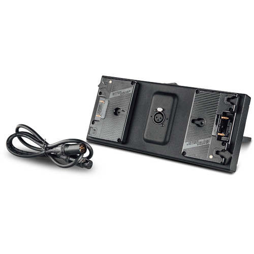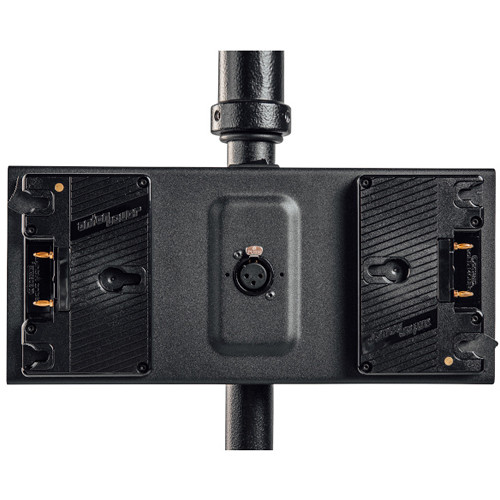 The Dual Battery Bracket for Gemini 2 x 1 Soft LED Panel from Litepanels accepts two 14.4V Gold mount batteries to power the Gemini 2 x 1 to run at 100% power. For on-set flexibility, the bracket mounts onto a stand or the panel's yoke. A 3-pin XLR cable is included.