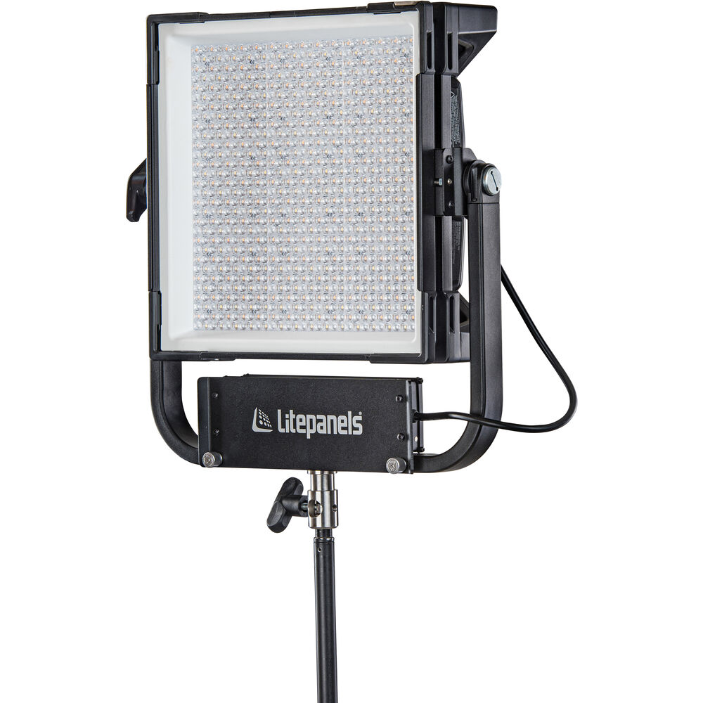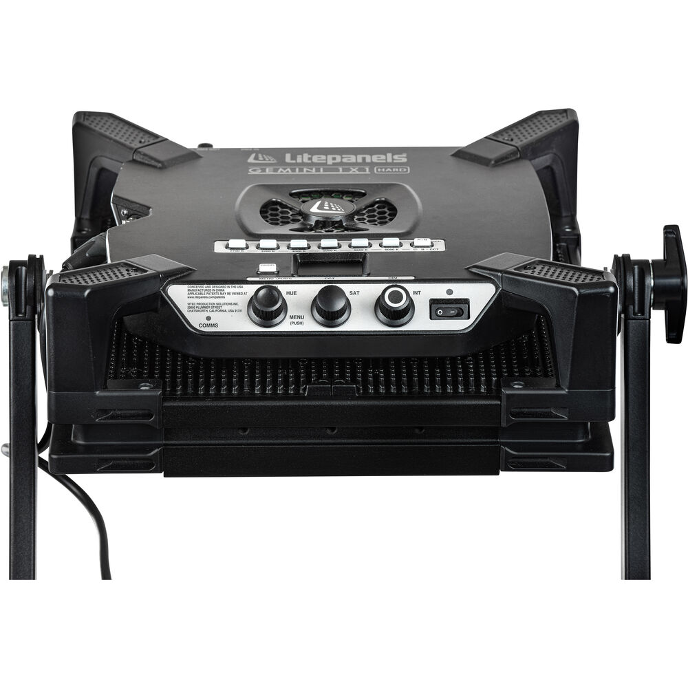 Stability, rugged construction, flexibility, and control are hallmarks of the Litepanels Gemini 1x1 Hard RGB LED Light Panel with Standard Yoke and UK Power Cord. Similar in design to the Gemini 2x1, the LED layout has been reconfigured with the Gemini 1x1, allowing it to create 60% of the output of the Gemini 2x1 with a medium-wide beam angle of 46 degrees. The aluminum-constructed, 12.6 x 12.6 x 4.6" RGBWW fixture has multiple lighting modes including CCT, Hue, Saturation, Gel Presets, as well as an effects mode. The CCT color temperature control has six factory presets in increments from 2700 to 10,000K. There are also six presets for user-defined color temperature and plus/minus green control. The HSI Color mode allows you to adjust the hue, saturation, and intensity, while Gel mode permits your choice from a library of filters favored by filmmakers, and an effects mode provides nine different effects to work with. The light has a CRI/TLCI rating of 98, indicating an accurate rendition of color. The Gemini is dimmable from 100 to 0.1% without flicker or color shift, and settings and features are displayed on the rear LCD screen.
