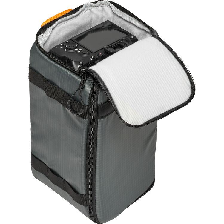 Lowepro designed the GearUp Pro II 5L Camera Cube to be a useful travel solution for keeping camera gear, drones, or other delicate electronic devices organized inside a larger bag. It accommodates a DSLR or mirrorless camera with an attached zoom lens up to 70-300 f/2.8. The bag is made from nylon that is resistant to water and tearing with padding for extra protection. The light-colored interior makes it easy to see what's inside.