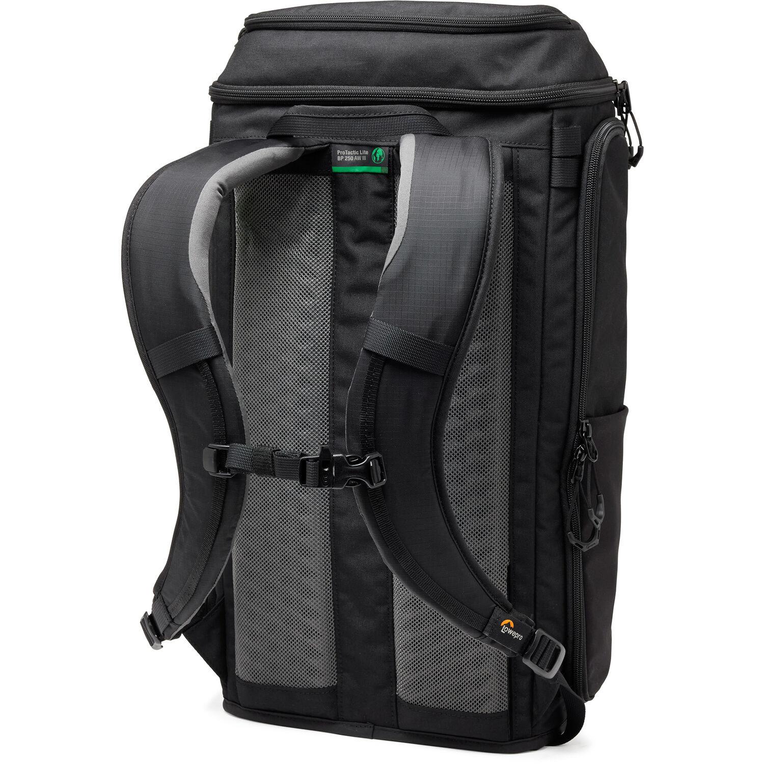Keep your camera gear and personal items protected during transport in the black, 30L ProTactic Lite BP 250 AW III Backpack from Lowepro. Top and side openings offer easy access to the main compartment, and a large, stretch front pocket stores accessories. The high rise divider offers customizable interior organization, and the pack accommodates a separately available GearUp camera insert or ProTactic SLX bag for additional organization. The hybrid webbing attachment system is compatible with SlipLock accessories or standard MOLLE or PALS pouches. Three exterior pockets hold your water bottle, travel tripod, and umbrella. The molded EVA back panel, dual-density harness, padded backpack straps, and SlideCam sternum strap ensure the pack is comfortable to carry, even on long hikes.