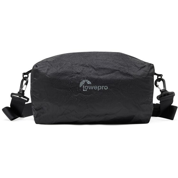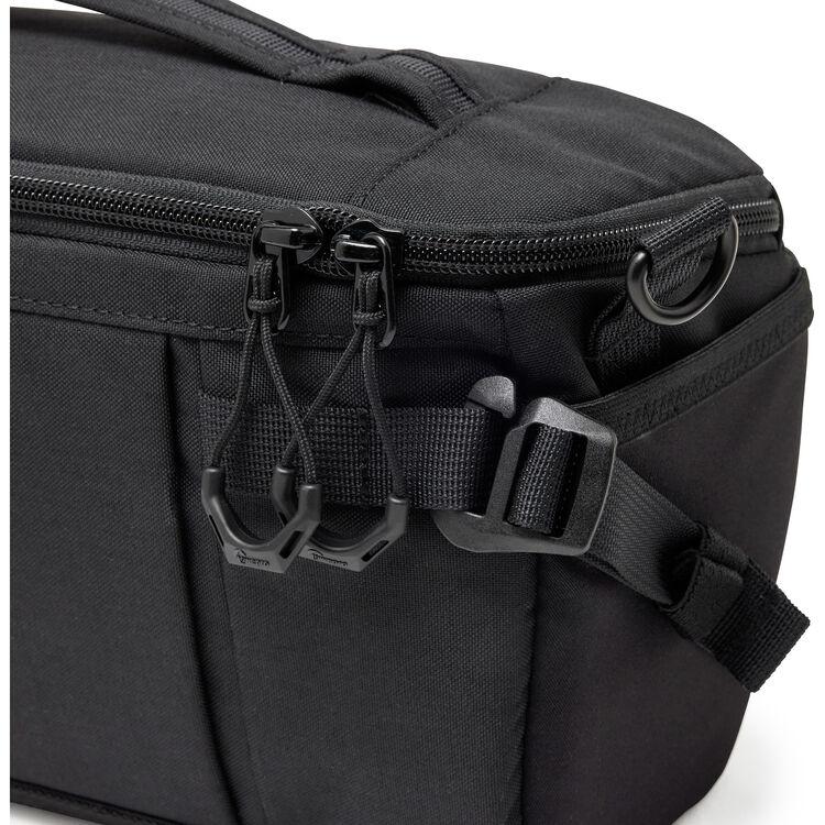 Carry and protect your mirrorless camera kit in the black, 5L ProTactic Lite SLX 120 AW III Sling Bag from Lowepro. This versatile bag accommodates a full-frame mirrorless camera with a 70-200mm lens. It has a top carry handle and a removable shoulder strap for wearing as a sling or a shoulder bag. It has multiple pockets including stretch side pockets for lens caps, a front pocket with key leash, a zippered door pocket, and a flat padded pocket on the rear. MaxFit dividers let you customize the interior to best fit your gear.