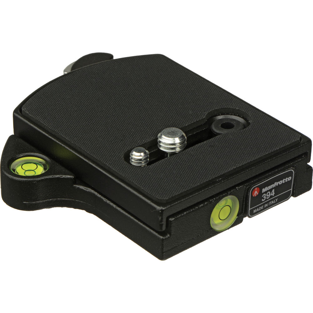 The sturdy Manfrotto 394 Low Profile Quick Release Adapter is an RC4 type quick release assembly system that comes with 1/4-20" and 3/8"-16 capacity, both on the camera and tripod ends, and comes supplied with the 410PL (RC4) quick release plate. The RC4 quick release base also includes a horizontal and vertical bubble level.