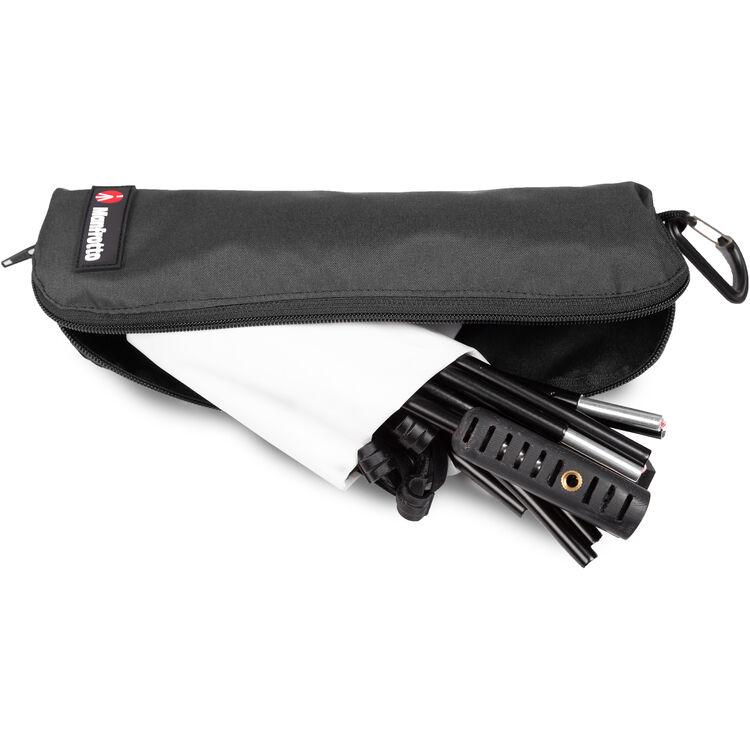 The supporting ring has a large, ergonomic handle that makes for a secure, comfortable grip when angling the Halo or holding it overhead. The frame also has 1/4" female threads and a 1/4" to 1/4" adapter for mounting options. The Halo folds down to a fraction of its open size to fit in the included bag for storage and transport.