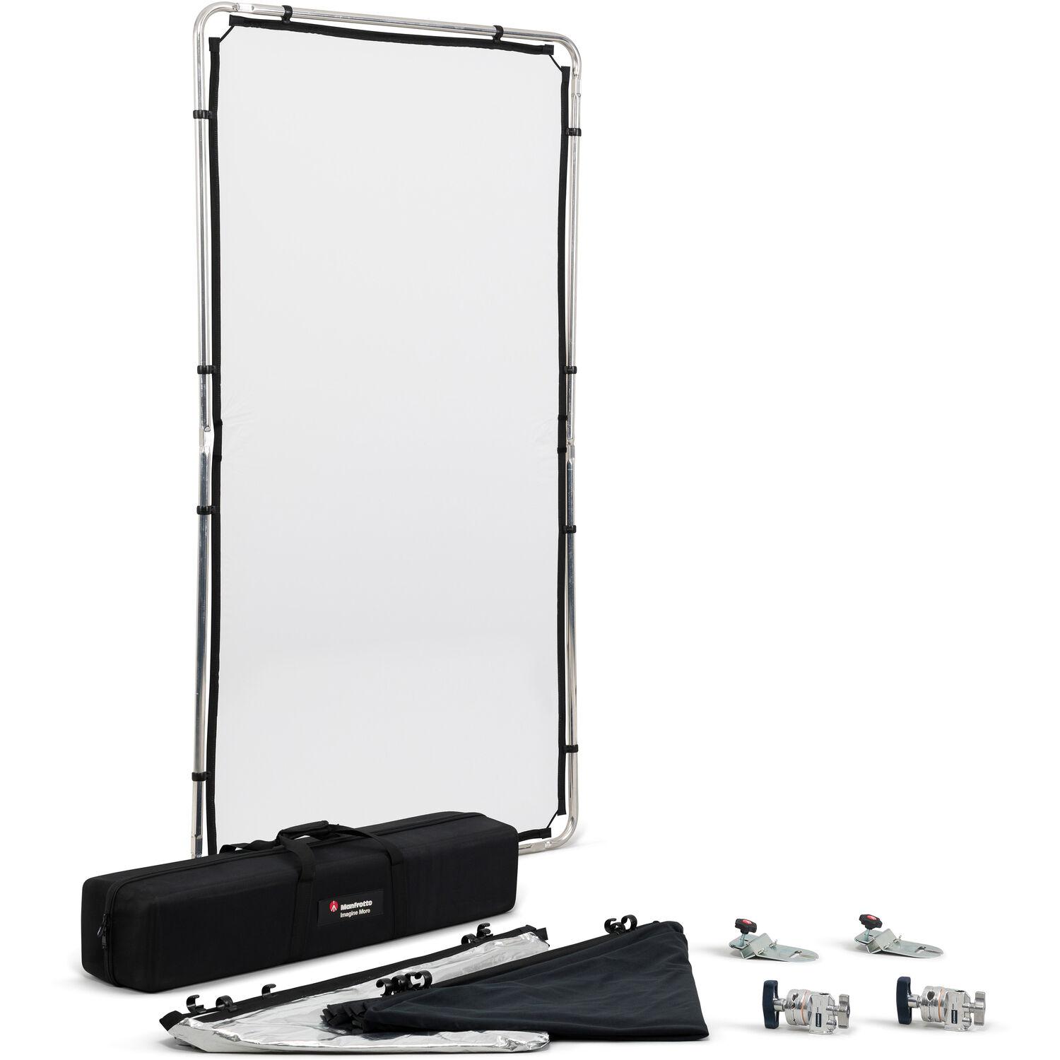 Ideal for full-length location shooting, the Manfrotto Medium Pro Scrim All-In-One Kit measures 3.6 x 6.5' and features a lightweight design, quick and easy setup, grip gear integration, and fabrics that are most popular with shooters. The kit is built around a sturdy aluminum frame and has an internal elastic cord that keeps it together when packed yet separate from other components.