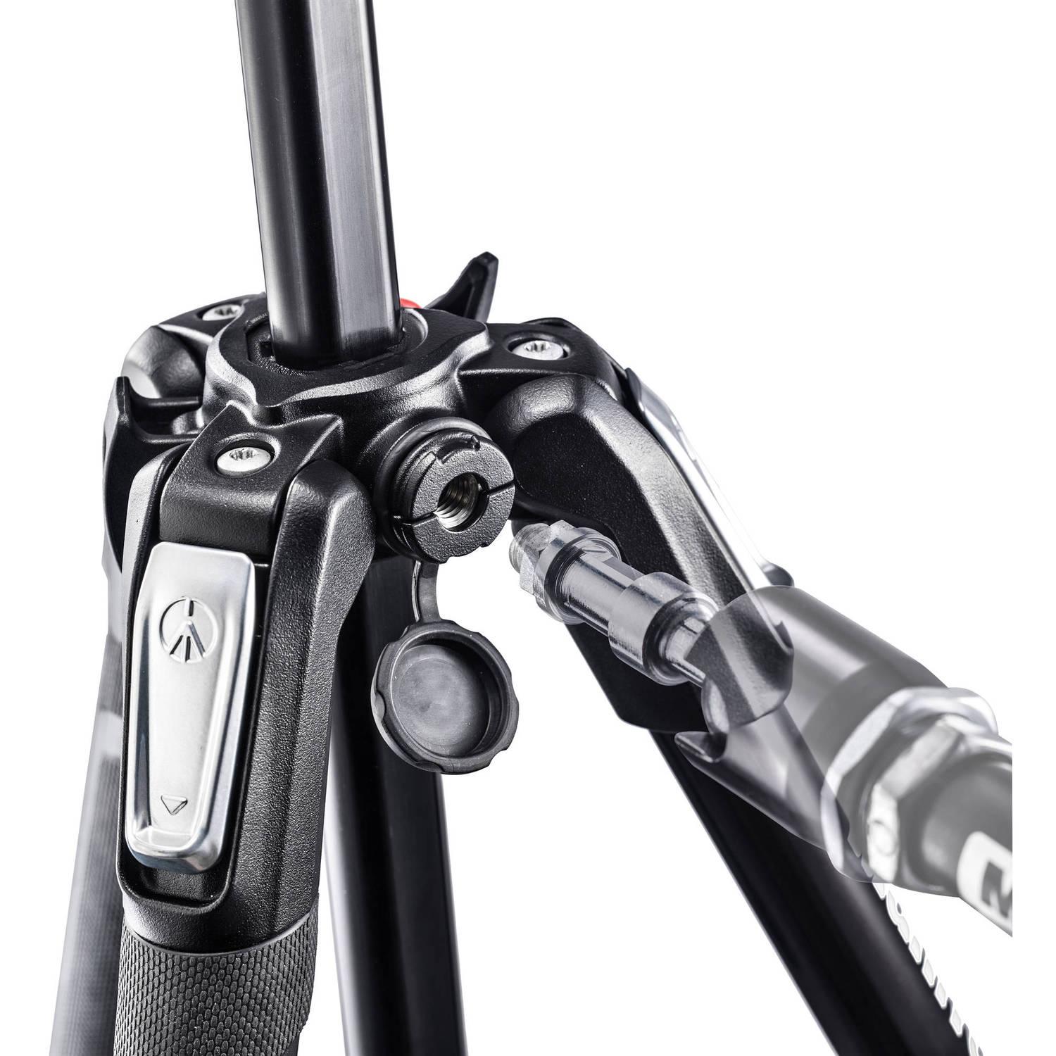 The Manfrotto MT190X3 Aluminum Tripod is an addition to the popular 190 series, adding a Quick Power Lock System, ground level adapter, and an Easy Link attachment. It can hold up to 33 lb of gear, and has a maximum height of 63". The ground-level adapter replaces the center column to allow the tripod's mounting plate to sit just 3.5" above the ground with the legs at their widest angle.