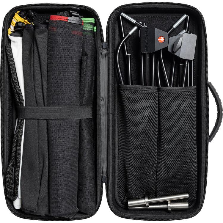 Quickly contour and control the light falling on your subject with this Rapid Flag Kit from Manfrotto. The kit includes four fabrics that are stretched into the 24 x 36" shape when attached to the brand's RapidExoframes. The kit contains a 0.6-stop single net, a 1.3-stop double net, a 1.6-stop artificial silk scrim, and a solid black duvetyne cover. Whether you're a content creator on-the-go or an image maker in need of portability, this kit is an all-in-one lighting modification system for shaping, diffusing, or blocking light in any environment.