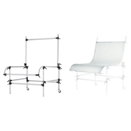 The silver-finished Manfrotto Still Life Shooting Table Frame without Plexiglass Panel consists of the aluminum tubular sections that join together to form the base for the separately purchased white, translucent Perspex shooting surface. The distance from the floor to the flat section of the shooting surface is 32.68" and the height including the adjustable back section is 76". The table has a load capacity of 33 lb. Wheels and other accessories are available for the table.